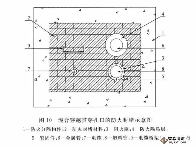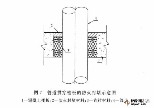 (5)管道貫穿孔口使用阻火圈或阻火包帶進行封堵時要注意,安裝部位需位于墻體兩側(cè)或樓板下側(cè);對于多種類型貫穿物混合穿越被貫穿體的部位,在有防火封堵板材或相應(yīng)防火封堵組件中如采用阻火圈或阻火包帶,要按產(chǎn)品使用要求進行安裝,保證遇火時不脫落。
