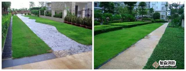 2 曲線化:將消防車道設(shè)計成曲折的步行小徑,采用種植草磚在小徑之外種植草皮,縮窄路面寬度,達到軟化、美化、綠化消防通道的目的。但由于草皮植土較淺,后期需要花費較多的養(yǎng)護費用。