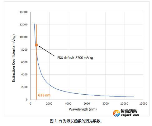 這繪制在圖1中??梢姽庾V從大約400nm(紫色)延伸到700nm(紅色)。評估波長-波長Wie633nm(用于獲得默認值的波長)處的質量比消光相關性Km在FDS中給出的消光系數為,該系數小于FDS()中使用的默認值,但接近推薦的不確定性下限。7626m2/kg8700 m2/kg
