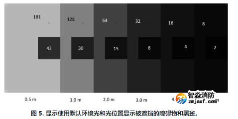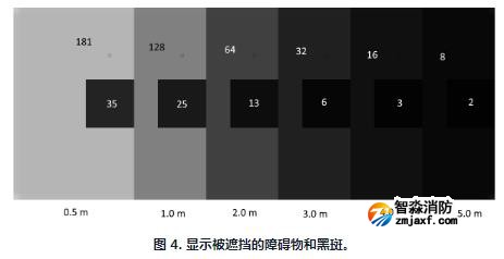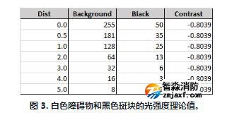 穆赫蘭指出,對于在白色背景下觀察的黑色物體,其值為C=-0.02通常用作定義可見性的對比度閾值。白色障礙物和黑色斑塊的預期光強度在圖3中給出,包括計算出的韋伯對比度。在這個問題中,背景和黑塊都被煙霧同等地遮擋,因此兩者的強度相同地降低并且計算出的韋伯對比度是恒定的。正如將要顯示,可見度隨著模糊度的增加而明顯降低,因此在這種情況下,Weber對比度似乎在計算可見度時沒有用。韋伯對比度的另一個問題是,對于純黑色物體(灰度為0),韋伯對比度方程將給出一個常數值-1.
