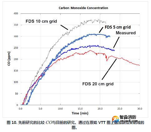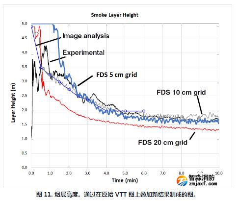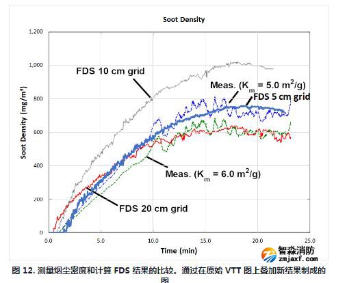 為了比較煙霧引起的能見度和遮擋,我們可以將實驗測量的煙塵密度與 FDS 結果進行比較,圖 12。讀者可以參考 VTT 論文了解密度測量的描述,但該過程使用公式 1、2 和 3,通過計算質量比消光系數作為函數,將使用 MIREX 設備進行的光透射測量轉換為密度的波長??梢钥闯觯? cm結果落在實驗數據范圍內。