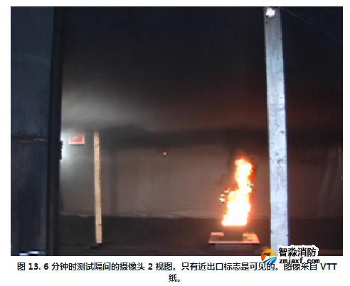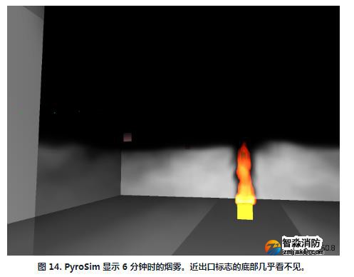 我們還可以與位于通風口外的相機拍攝的圖像進行直接比較。 圖 13顯示了 6 分鐘時的圖片。這可以與圖 14 中的 PyroSim 圖像進行比較,后者顯示的煙霧層稍低。我們還可以看到,在幫助照亮出口標志的實驗中包括了室內照明。如煙層底部的紅色調所示,火也有助于照明。