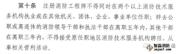 第十條《136號令》和《143號令》就有明確規(guī)定,注冊消防工程師不得在兩個及以上機構執(zhí)業(yè),這里再次重申,那么換個角度,對于注冊消防工程師的數(shù)量需求會劇增!同時,后面提到相應的干部一定年限內(nèi)不得在原機構聘任,為啥?防止權錢交易,不多說,大家都懂的!
