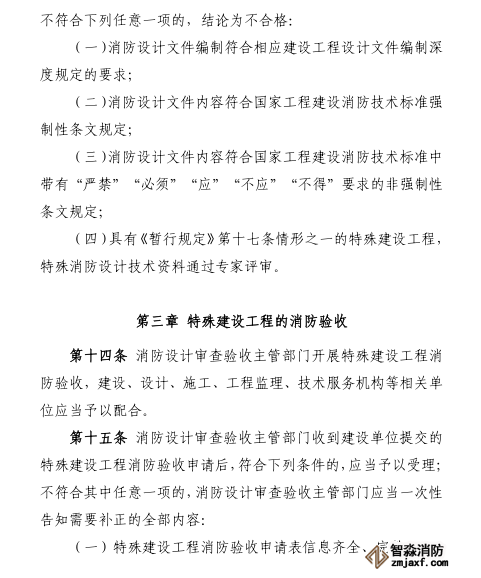 第三十條 消防設計審查驗收主管部門應當自受理消防驗收申請之日起十五日內出具消防驗收意見。對符合下列條件的,應當出具消防驗收合格意見: