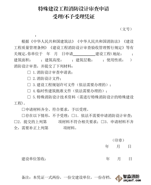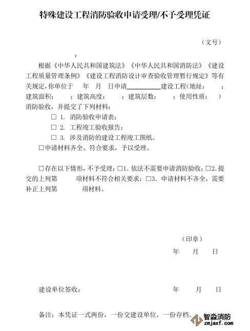 消防設計審查驗收主管部門收到建設單位提交的消防驗收申請后,對申請材料齊全的,應當出具受理憑證;申請材料不齊全的,應當一次性告知需要補正的全部內容。