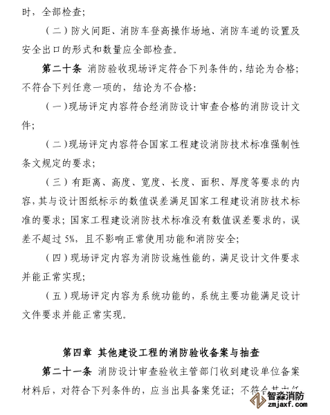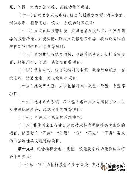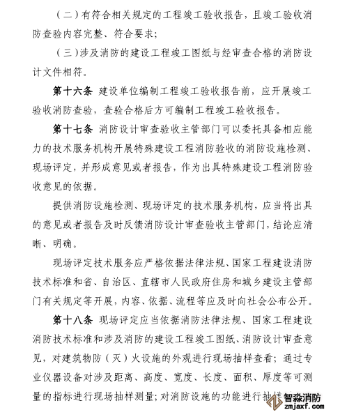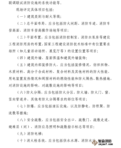 第二十九條 消防設計審查驗收主管部門受理消防驗收申請后,應當按照國家有關規定,對特殊建設工程進行現場評定。現場評定包括對建筑物防(滅)火設施的外觀進行現場抽樣查看;通過專業儀器設備對涉及距離、高度、寬度、長度、面積、厚度等可測量的指標進行現場抽樣測量;對消防設施的功能進行抽樣測試、聯調聯試消防設施的系統功能等內容。