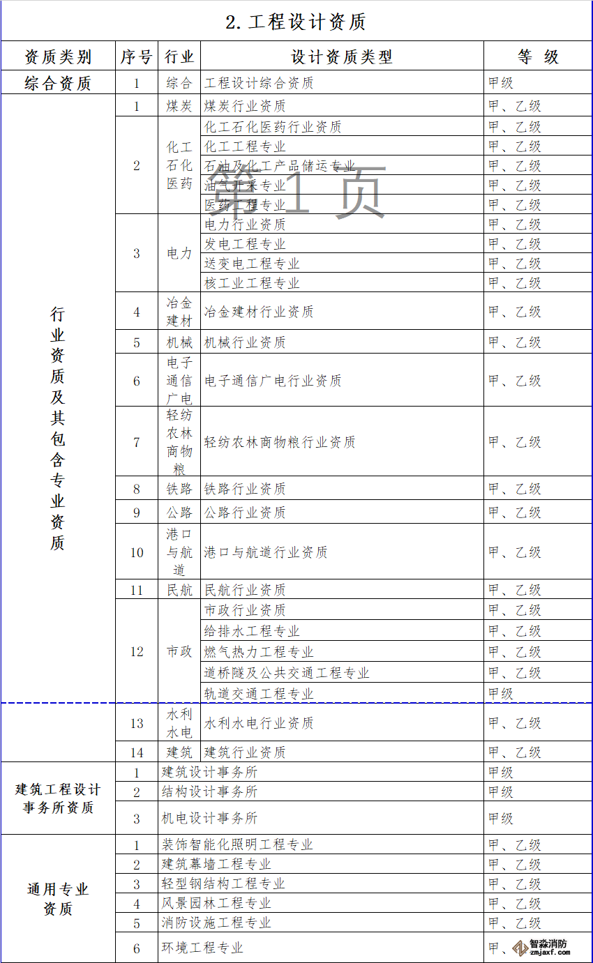 對部分行業資質進行整合,其中,冶金行業與建材行業合并為冶金建材行業資質,輕紡行業、農林行業、商物糧行業合并為輕紡農林商物糧行業,電子行業、通信行業、廣電行業合并為電子通信廣電行業,石油天然氣行業并入化工石化醫藥行業,軍工行業并入機械行業,核工業行業并入電力行業,資質等級壓減為甲、乙兩級,原丙級資質并入相應行業乙級資質。