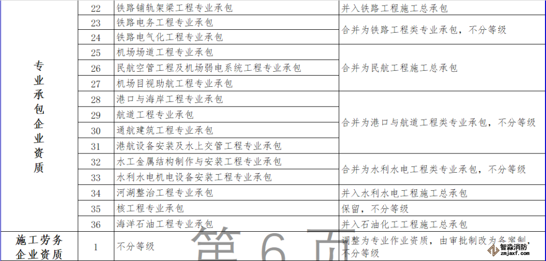 保留地基基礎工程、起重設備安裝工程、核工程等專業承包資質;將原專業承包資質整合為建筑裝修裝飾類、建筑機電類、公路工程類、港口與航道工程類、鐵路工程類、水利水電工程類、通用類專業承包資質;專業承包資質不分等級。
