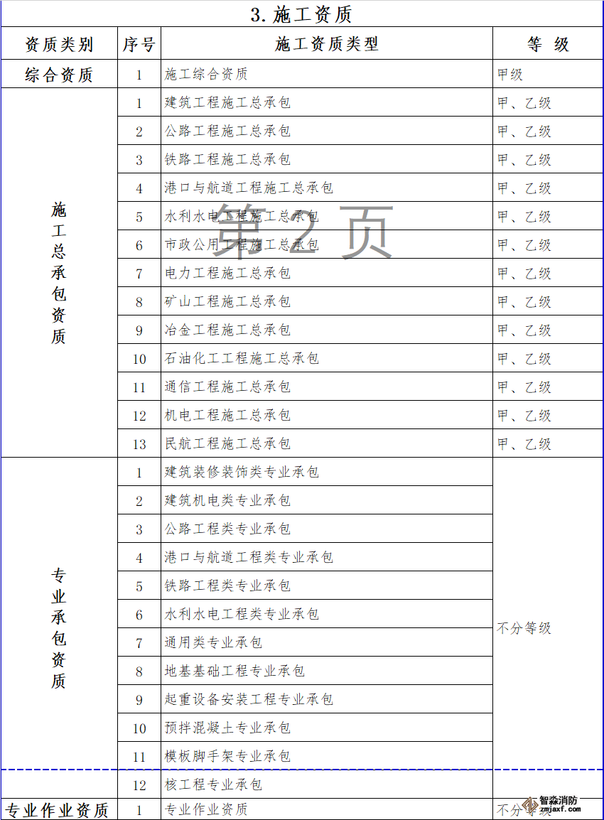 消防設施施工專業承包資質和其他幾項資質合并為通用類專業承包,不分等級。