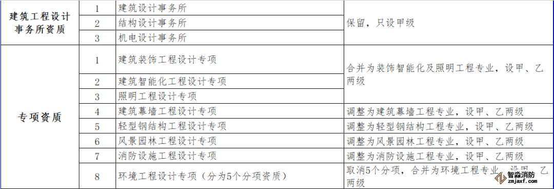 專項設計資質中,將消防設施工程設計調整為消防設施工程專業,設甲、乙兩級。