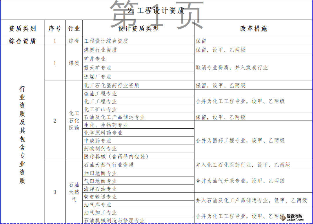 取消海洋行業及專業資質,相關企業可以換發相近行業資質。整合原化工石化醫藥、石油天然氣、電力、市政行業中的專業資質,資質等級壓減為甲、乙兩級,原丙級資質并入相應專業乙級資質;取消其他行業的專業資質,并入相應行業資質,原甲、乙級專業資質并入相應等級的行業資質,原丙級專業資質并入乙級行業資質。