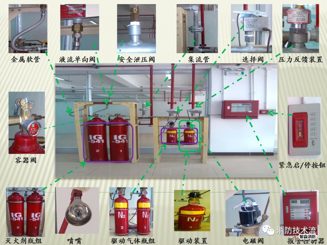滅火劑瓶組、容器閥、單向閥、集流管、安全泄壓閥、選擇閥、驅(qū)動裝置、驅(qū)動氣體瓶組、壓力反饋裝置、噴頭、火災(zāi)報警控制器、噴嘴、管道管件及吊鉤支架等部件組成。